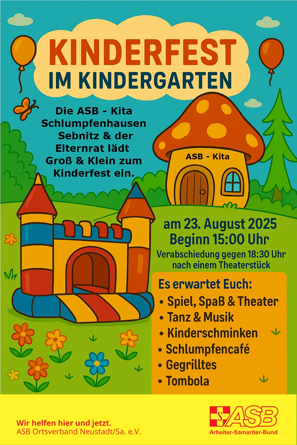Die Kindertagesstätte Schlumpfenhausen und der Elternrat laden Groß und Klein am 23.08. ab 15 Uhr zum Kinderfest ein. Es erwartet euch Spiel, Spaß und Theater. Für euer leibliches Wohl wird natürlich auch gesorgt. Wir freuen uns auf euren Besuch! |