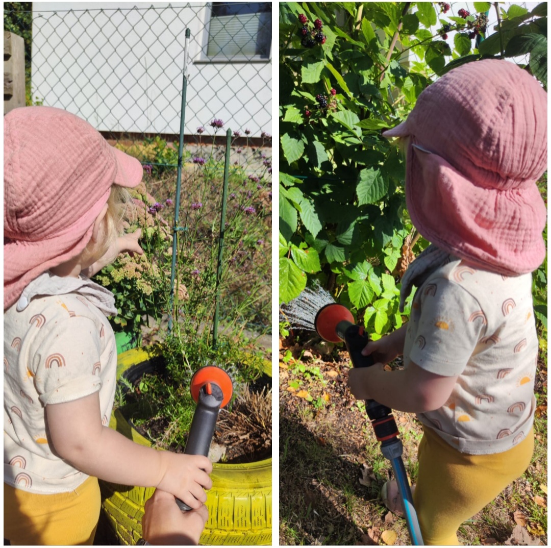 Das Gießen von Pflanzen lieben unsere Kinder. Sie übernehmen dabei spielerisch Verantwortung und erleben, wie wichtig Wasser für das Wachstum ist. Ganz nebenbei werden Feinmotorik, Konzentration und Naturverständnis gefördert. Auch die sprachliche Entwicklung wird durch Gespräche über Pflanzen, Beobachtungen und das gemeinsame Benennen von Handlungen gefördert. |