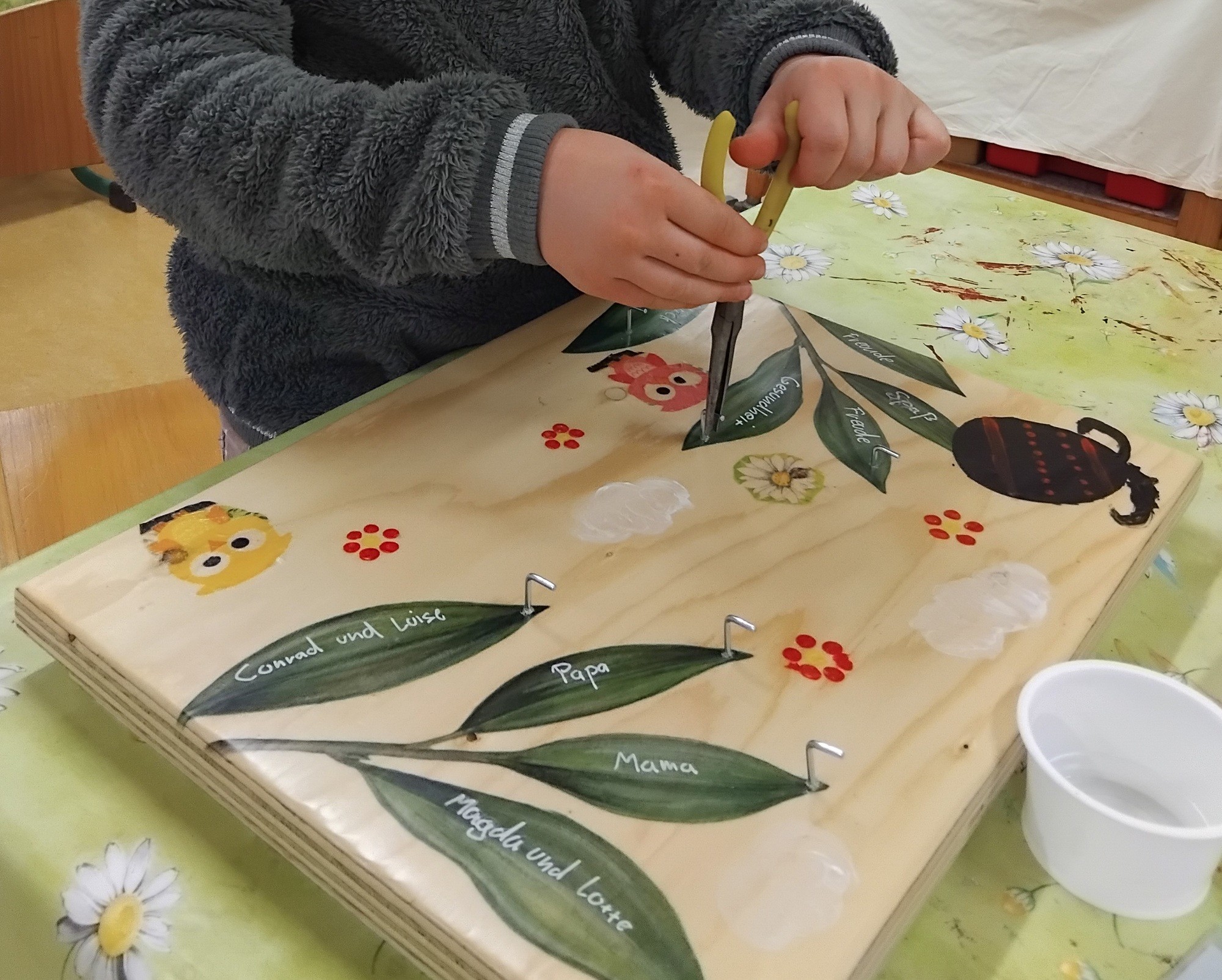 Stellt euch vor, ihr wollt schnell los, bloß noch die Tür abschließen und Verflixt noch mal! Wo ist der Schlüssel? Diese Situation kennt sicherlich jeder. Was kann da helfen? Ein fester Platz, an dem der Schlüssel abgelegt wird. Wie wäre es da mit einem Schlüsselbrett? Vor einiger Zeit hat eine Frau uns Hortkindern Teebretter geschenkt. Ein Teebrett? Es dient als Unterlage und Servierbrett. Darauf werden alle Gegenstände angeordnet, die man für die Teezeremonie (die Zubereitung und das Trinken) benötigt. Eine japanische Teezeremonie besteht aus mehreren Schritten Der Gast wandelt auf einem Gartenpfad, um sich auf die eigentliche Zeremonie vorzubereiten. Der Gastgeber lädt ins Teehaus ein. In einem Warteraum begrüßt er seine Gäste mit heißem Wasser. Die Gäste wandeln wieder auf dem Gartenpfad. Der Gastgeber stellt frisches Wasser und eine Schöpfkelle bereit, womit sich die Gäste Mund und Hände waschen. Sie entledigen sich somit symbolisch alles Üblem. Beim Betreten des Teeraumes lassen sie sich auf die Knie nieder, um Demut und Respekt zu zeigen. Es folgt ein mehrgängiges Menü mit leichten Speisen, das Kaiseki. Nach dem Essen werden die Gäste noch einmal in den Warteraum gebeten. Anschließend begeben sie sich in den eigentlichen Teeraum. Hier wird nun nach einer festgelegten Zeremonienfolge Tee serviert. Das klingt spannend, aber kaum jemand von uns nimmt sich so viel Zeit zum Teetrinken. Was sollten wir nun aber mit den Teebrettern tun? Eine Erzieherin hatte die Idee, daraus Schlüsselbretter anzufertigen. Aus etwas Altem ein neues Ordnungssystem schaffen. Gesagt getan. Wir verzierten die Bretter mit der Serviettentechnik und bemalten sie zusätzlich mit Acrylfarben ganz nach unseren individuellen Vorstellungen. Mit Acrylstiften schrieben wir die Namen der Schlüsselbesitzer und Wünsche darauf. Nach dem Lackieren drehten wir kleine Haken in die Bretter. So entstanden einzigartige Schlüsselbretter. Einige davon versteckt der Osterhase ganz heimlich für Mama und Papa.Die Handwerker und Künstler aus dem Hort der ASB Kita Schlumpfenland Langenwolmsdorf |