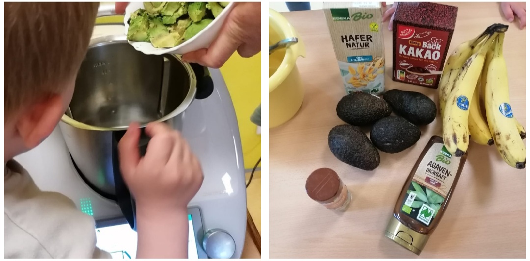 Zum Abschluss der Woche stand ein besonderes kulinarisches Highlight auf unserem Plan Für das gemeinsame Vesper haben wir einen gesunden Avocado-Schoko-Smoothie gezaubert. Mit Unterstützung von Theo Thermomix? verwandelten sich frische Zutaten in ein cremiges Geschmackserlebnis.Diese Lernschritte steckten in unserer KüchenaktionGanzheitliche Sinneswahrnehmung Bevor gemixt wurde, haben wir die Zutaten genau unter die Lupe genommen. Wie fühlt sich eine Avocado an? Wie riecht Zimt? Und wie schmeckt eigentlich reiner Backkakao? Die Kinder konnten alles tasten, riechen und probieren.Lebensmittelkunde Wir haben neue Lebensmittel kennengelernt. Besonders die Avocado mit ihrem großen Kern sorgte für Staunen. Auch der Unterschied zwischen Hafermilch und herkömmlicher Milch war Thema.Praktische Alltagskompetenzen Beim Schälen der Bananen und dem Befüllen des Mixtopfs war echte Mitarbeit gefragt. Das fördert die Feinmotorik und das Verständnis für die Zubereitung von Mahlzeiten.Technik Akustik Den Thermomix in Aktion zu erleben, ist immer ein Erlebnis. Die Kinder beobachteten den Prozess und mussten bei den lauten Mix-Geräuschen auch mal kurz die Ohren zuhalten.Gemeinschaftserlebnis Das Beste kam zum Schluss. Das gemeinsame Verkosten. Zu sehen, dass gesund? auch richtig lecker sein kann, war für alle eine tolle Erfahrung.Ein schmackhaftes Projekt, das nicht nur satt, sondern auch Lust auf gesundes Essen macht. |